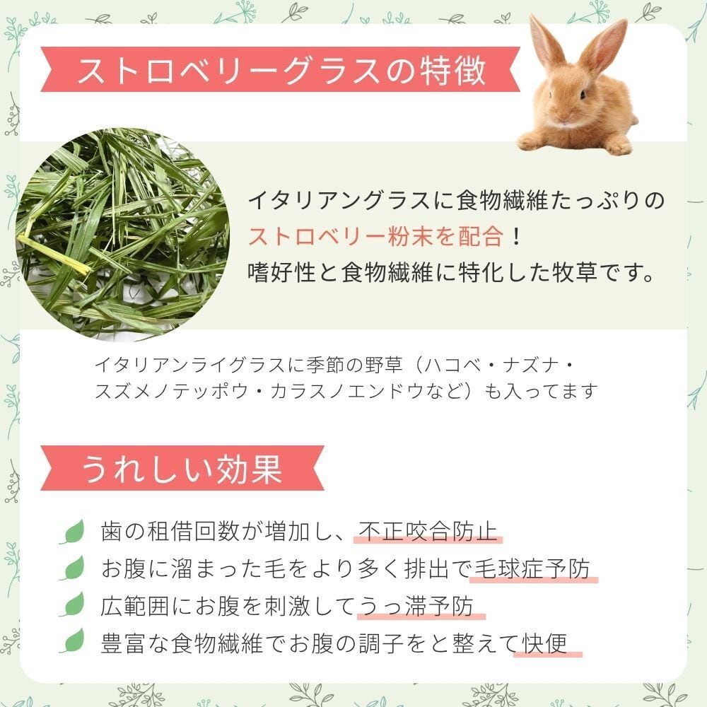 国産・無農薬・無肥料・無除草剤で栽培したイタリアンライグラスにストロベリーファイバーを配合。
