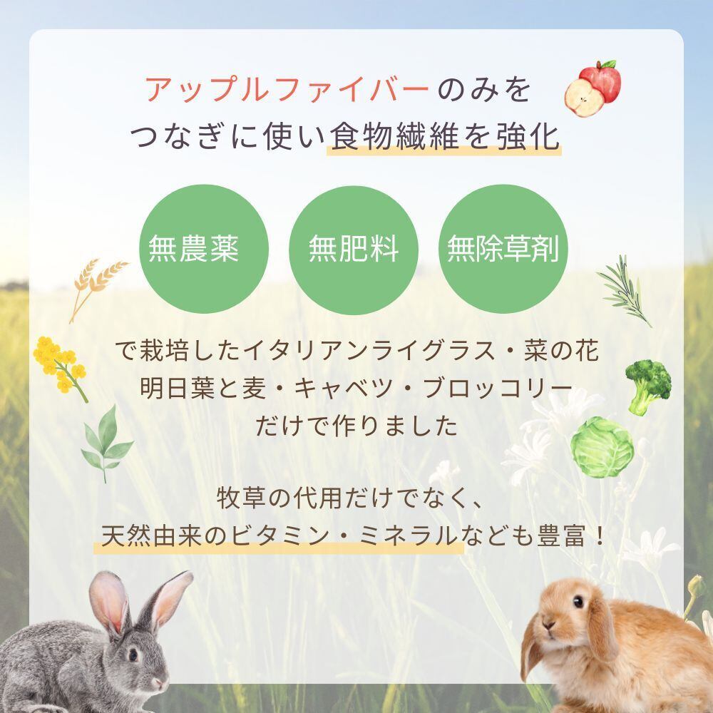 無農薬・無肥料・無除草剤で栽培されたイタリアンライグラス、菜の花、明日葉、麦、キャベツ、ブロッコリー、だけで作られたペレット