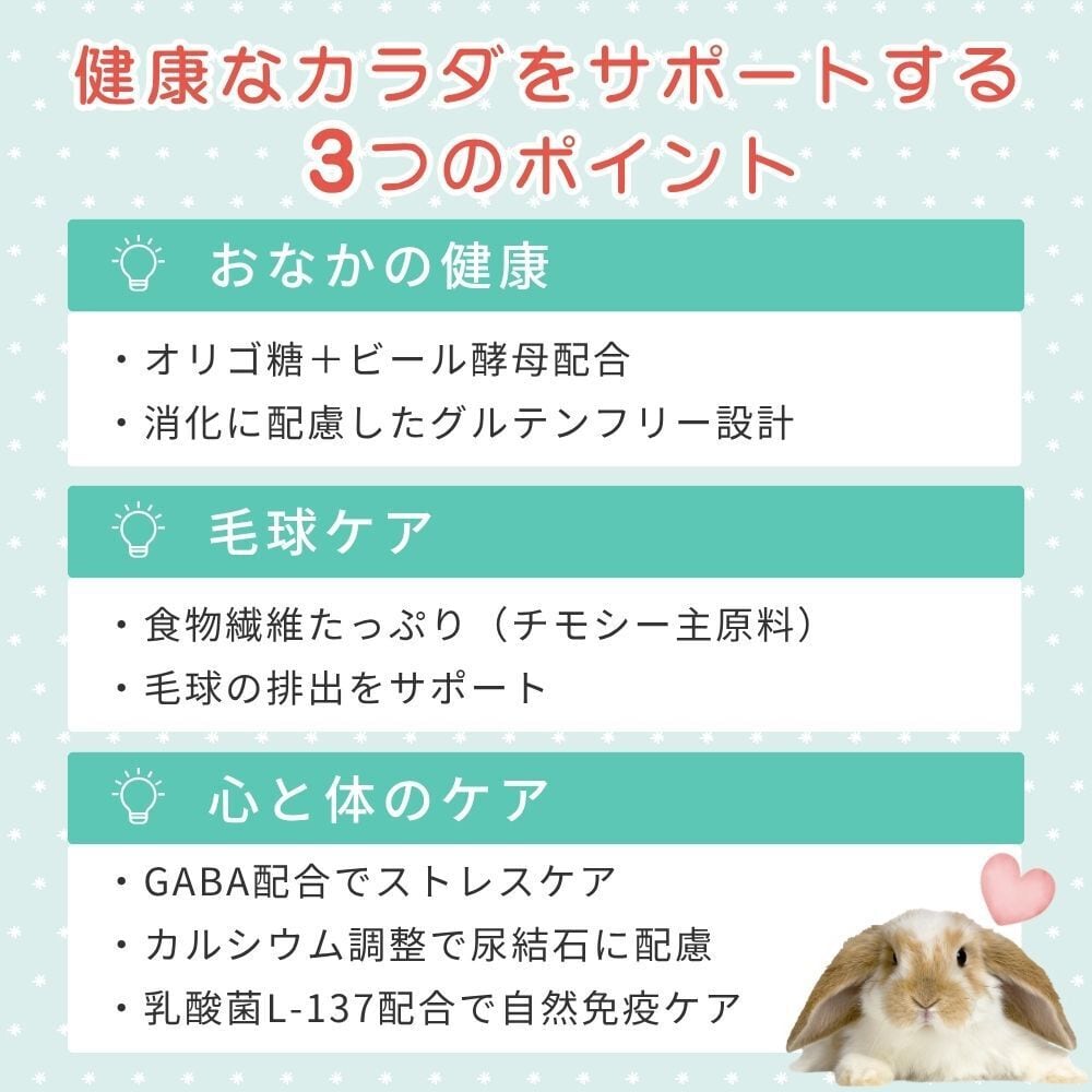 ウサギの気になる健康「おなか」「毛球」「心のケア」に配慮。