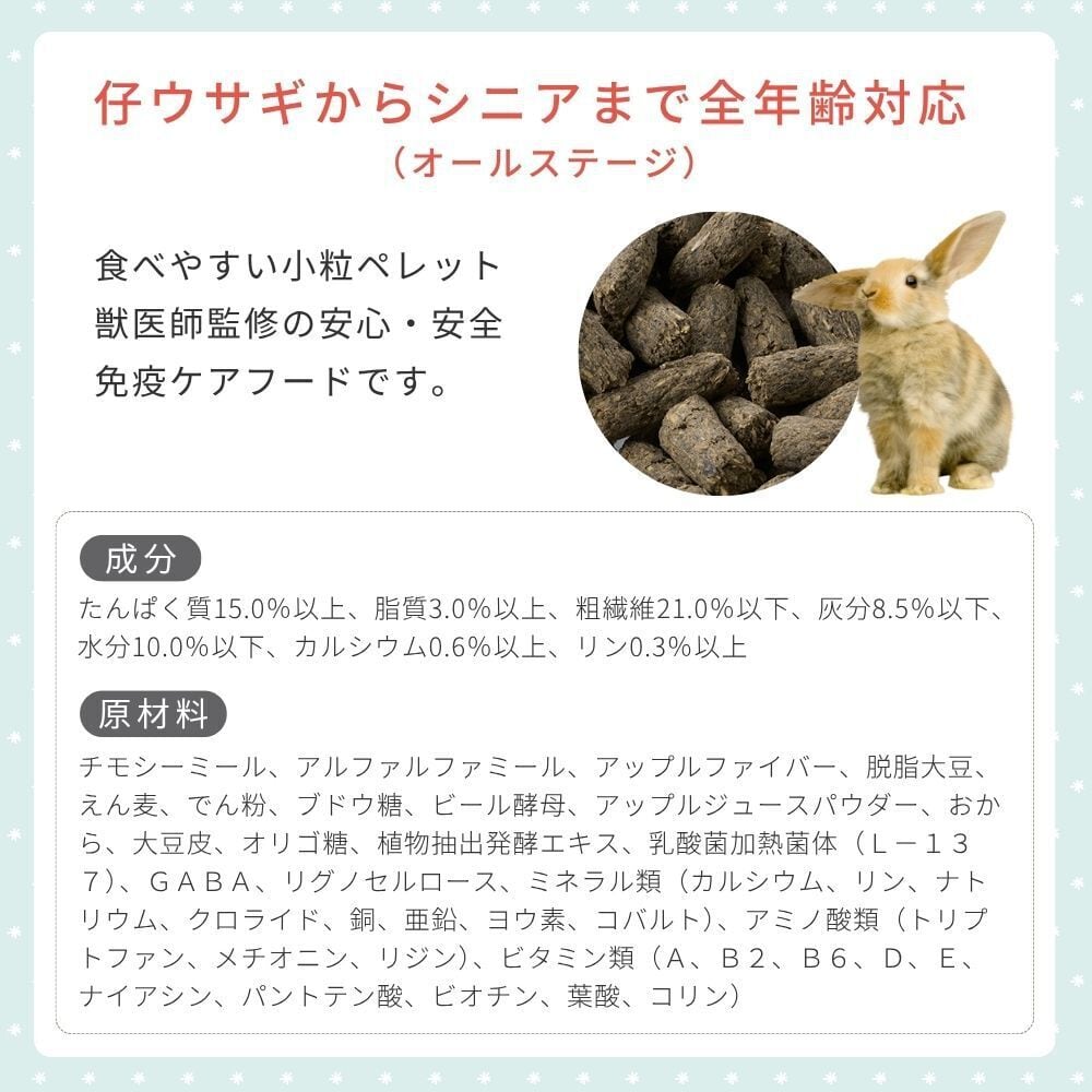 小粒で食べやすいペレットなので仔ウサギからシニアまで全ての年齢に対応(オールステージ)